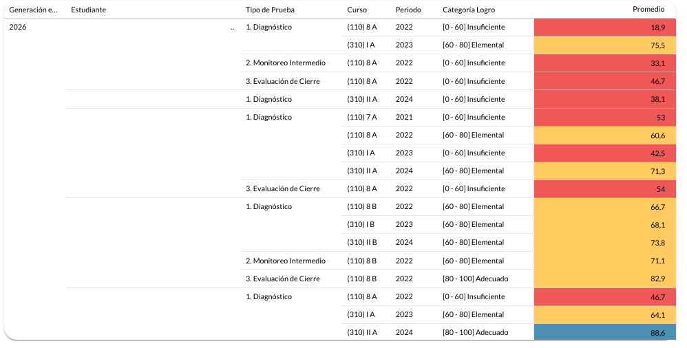 En esta vista verán una tabla comparativa de los resultados educativos de todos los niveles para una prueba y año específico. La tabla permite visualizar el promedio de cada nivel y la distribución de estudiantes que la componen en términos de categorías de logro.