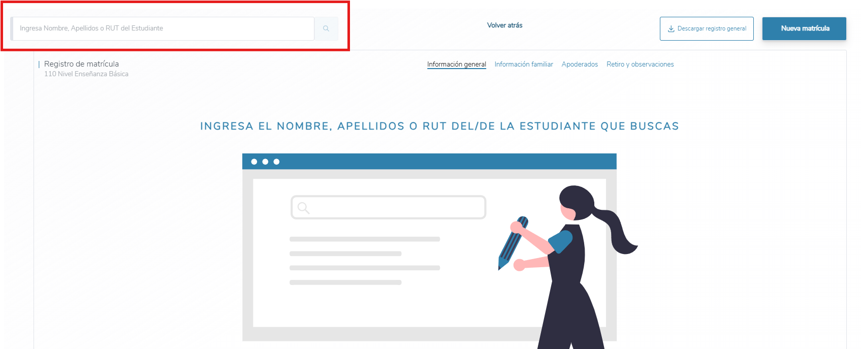 Se te abrirá la siguiente ventana y allí podrás ingresar en la barra de búsqueda el nombre, apellido o RUT del estudiante que quieres localizar.