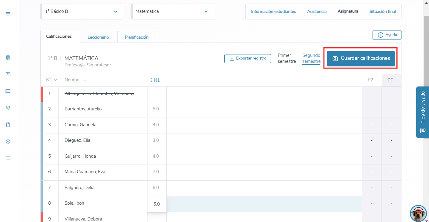 ¡Importante! ⚠️ Las calificaciones se verán en gris hasta que no las guardes. No olvides seleccionar el botón azul "Guardar" una vez que hayas registrado toda la información