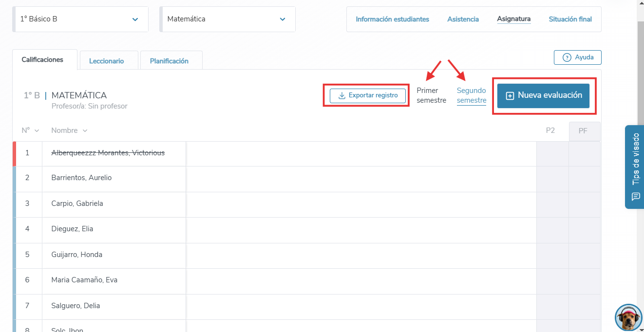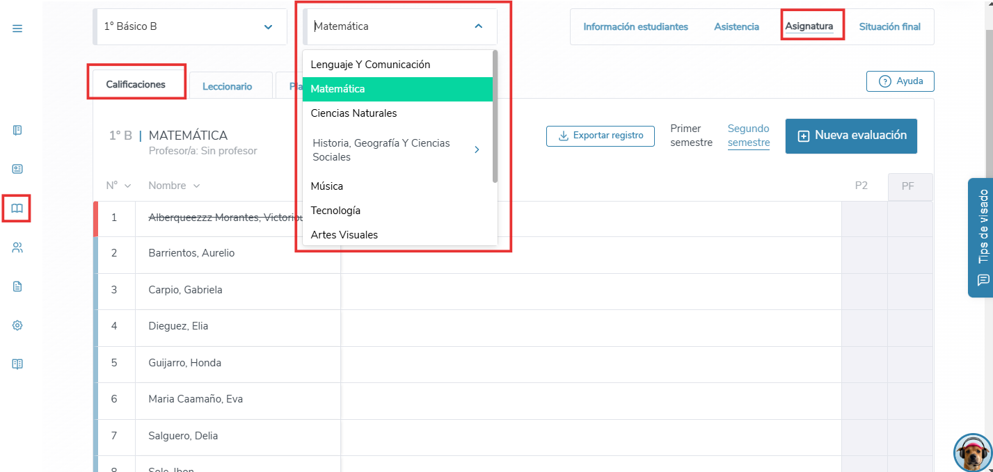 Primero que todo, debes seleccionar el libro de clase del curso en el que quieras crear evaluaciones. Una vez ahí, dirígete a la sección "Asignatura" y escoge la clase que impartes o en la que quieras agregar una evaluación. A modo de ejemplo, seleccionaremos "Matemática".