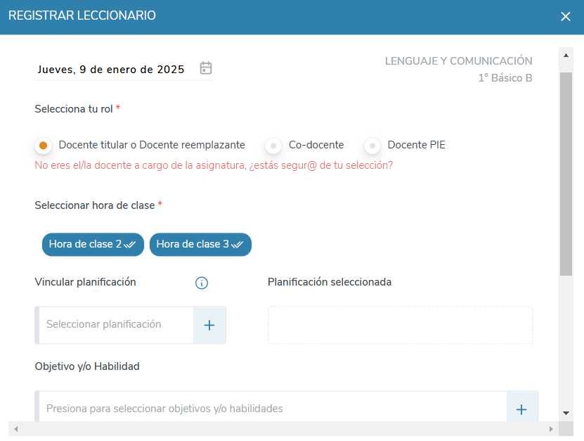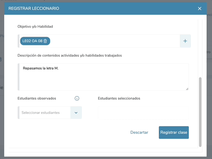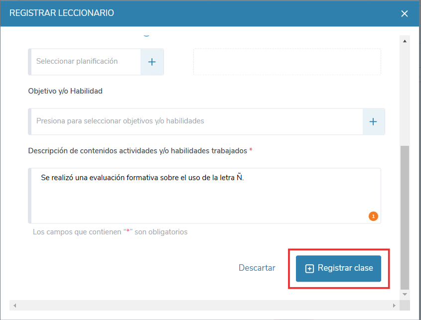 Aquí podrás asociar los Objetivos de Aprendizaje y/o habilidades tratados en la clase realizada y, además, vincular una planificación ya registrada en el Planificador.