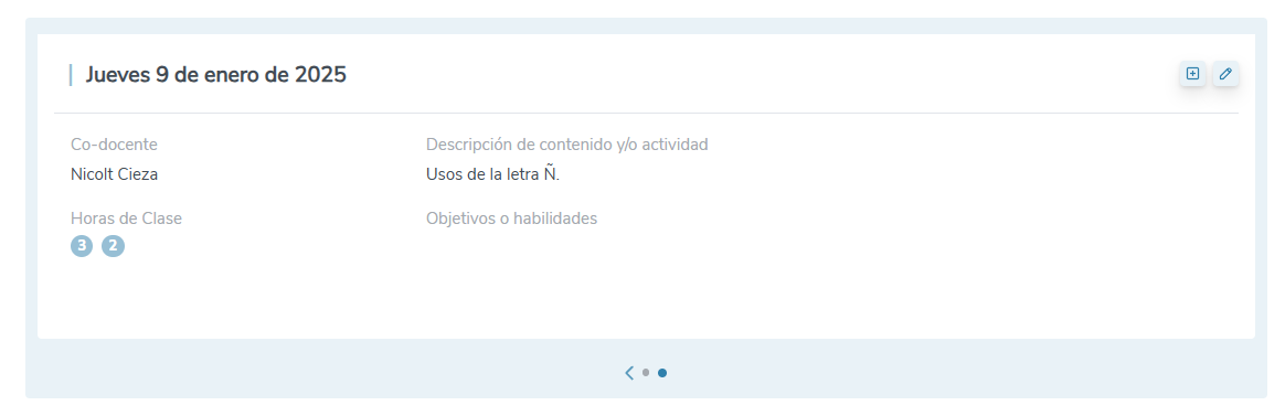 Por lo cual, al darle clic al cuadrado con el signo "+" de "Agregar actividad", la Co-Docente podrá registrar un nuevo leccionario, un leccionario múltiple, para ese día en las horas que indique en la asignatura de Lenguaje.