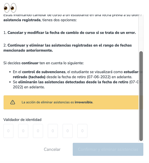 Si quieres continuar con el retiro, ingresa los números de tu validador de identidad y selecciona el botón "Confirmar y eliminar asistencias".