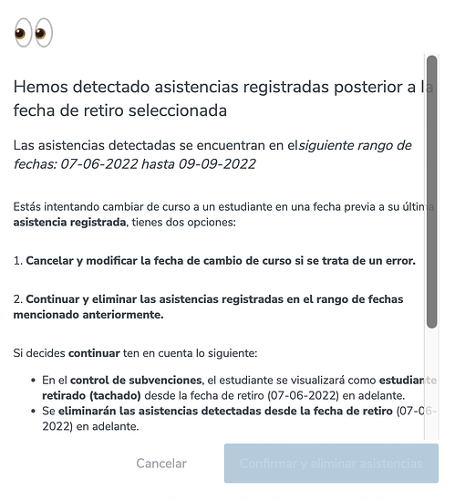 Sigue los mismos pasos descritos anteriormente. Si el estudiante que quieres retirar cuenta con asistencia registrada posterior a la fecha de retiro, aparecerá una advertencia como esta: