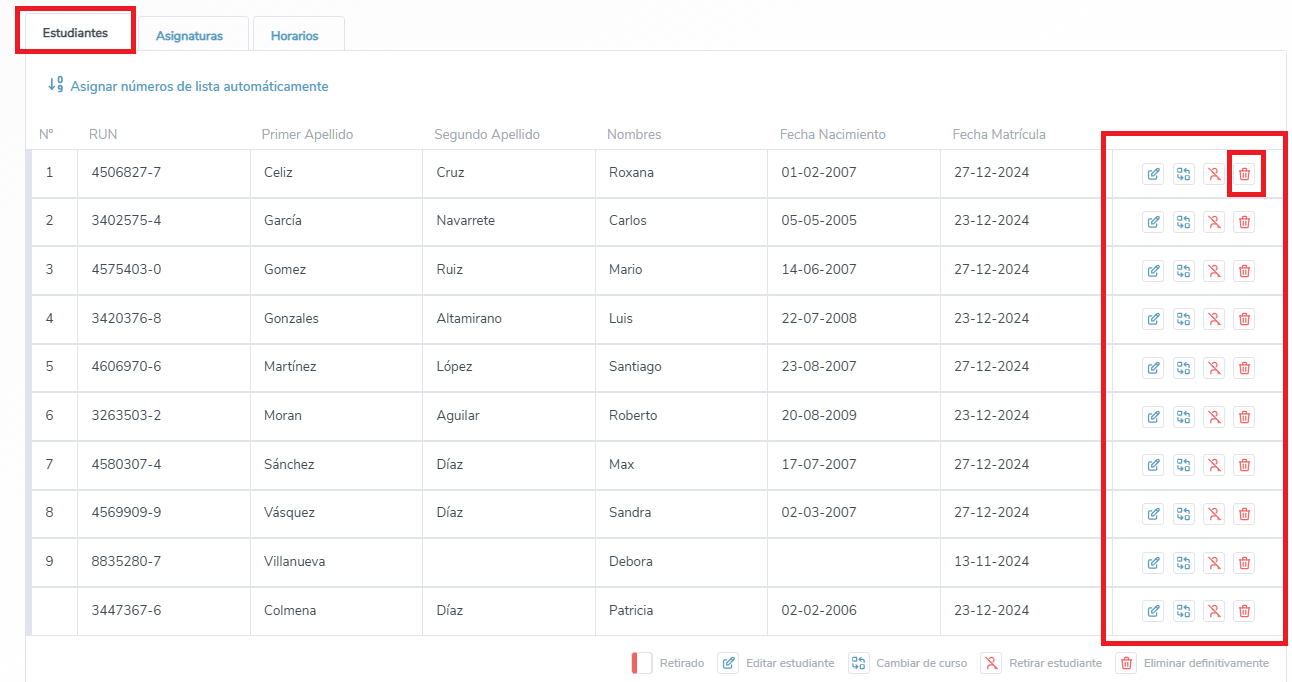 4. Una vez adentro de la pestaña estudiante puedes pinchar en el ícono para retirar o eliminar al alumno.
