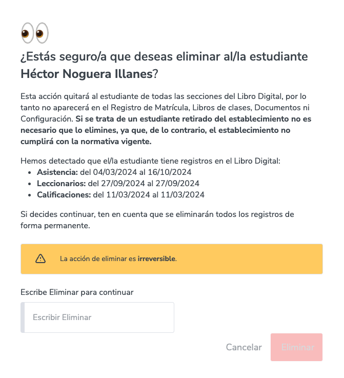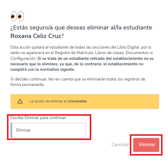8. Si, por el contrario, en lugar de retirar al alumno quieres eliminarlo, deberás hacer clic en el botón "Eliminar".