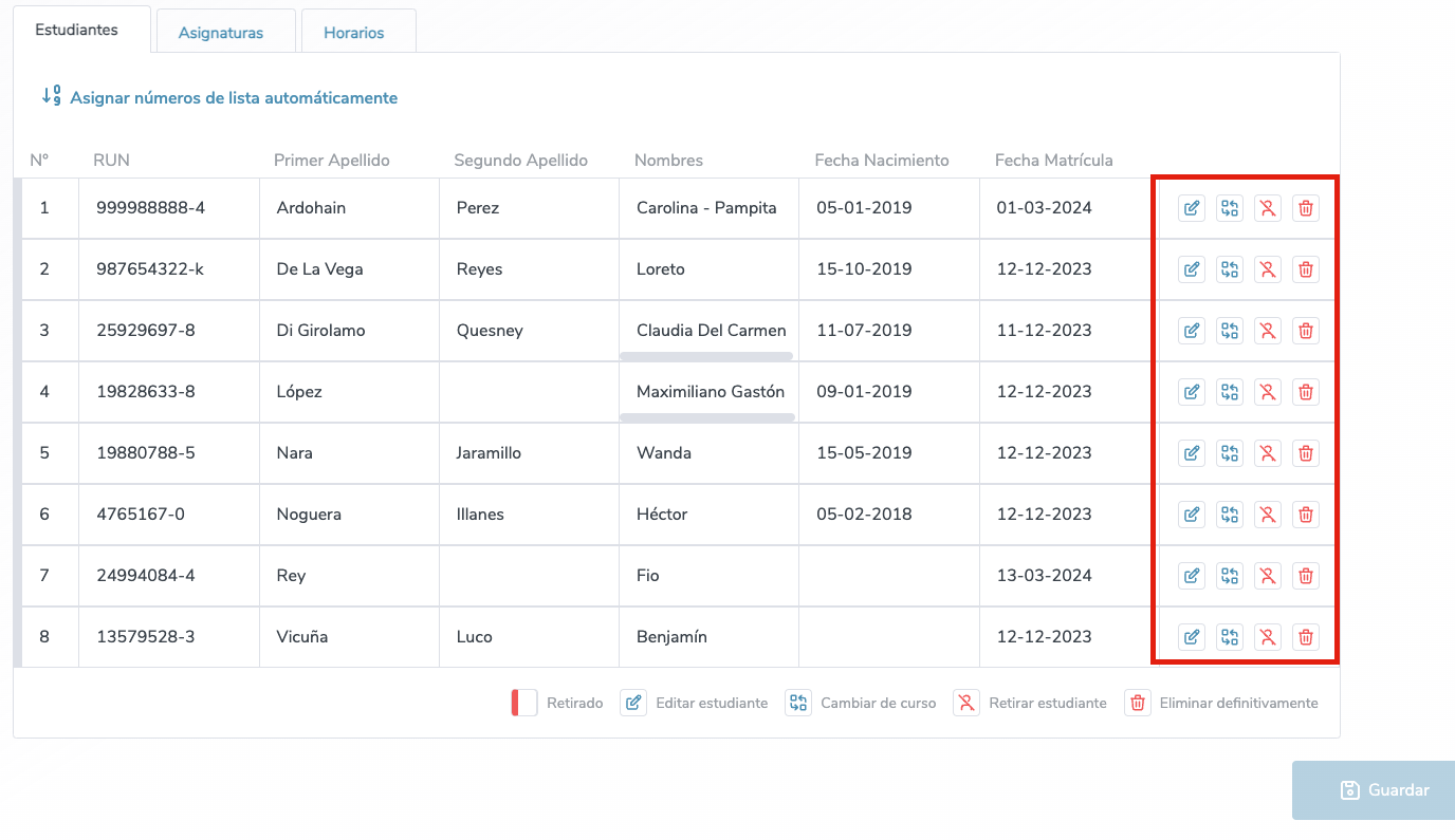 3. Haz clic en la pestaña "Estudiantes" y a la derecha del nombre aparecen tres opciones: editar, cambiar de curso y/o retirar estudiante.