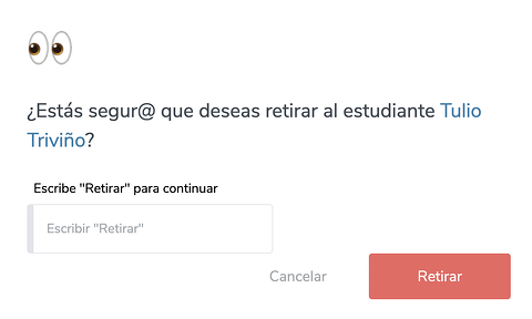 7. Al hacer clic en el botón "Retirar estudiante" por seguridad se abrirá un mensaje de confirmación donde deberás escribir "Retirar" y luego apretar el botón "Retirar".