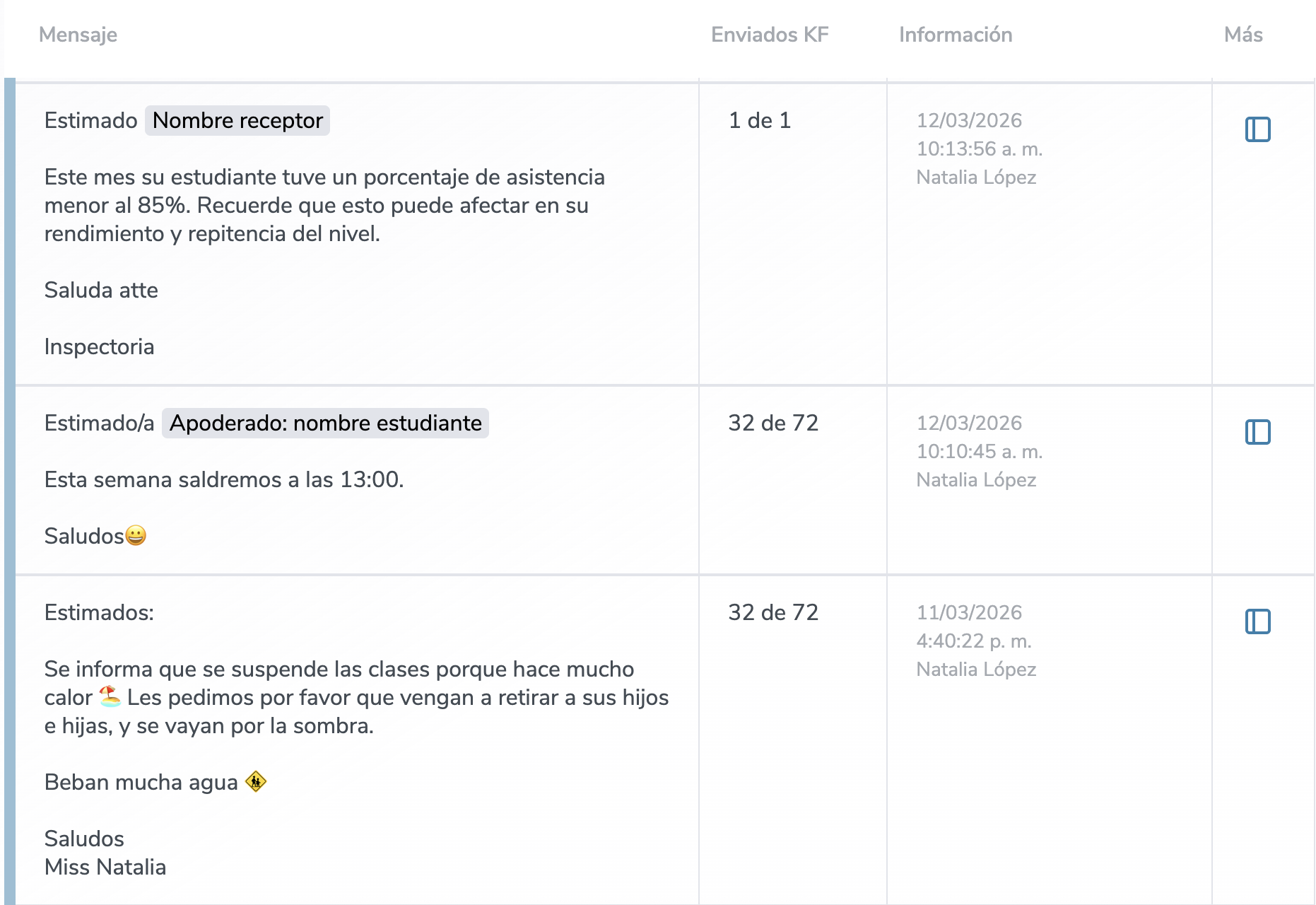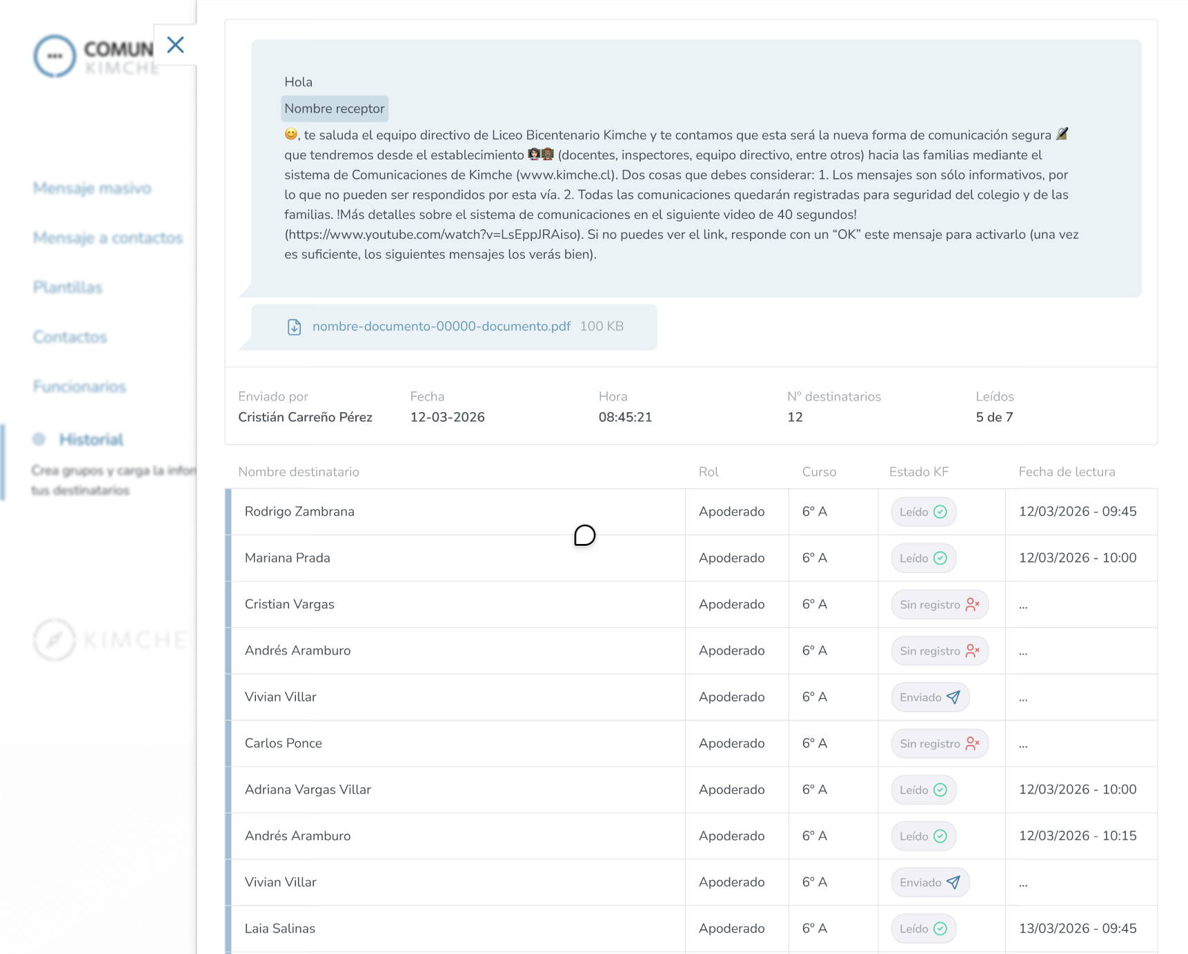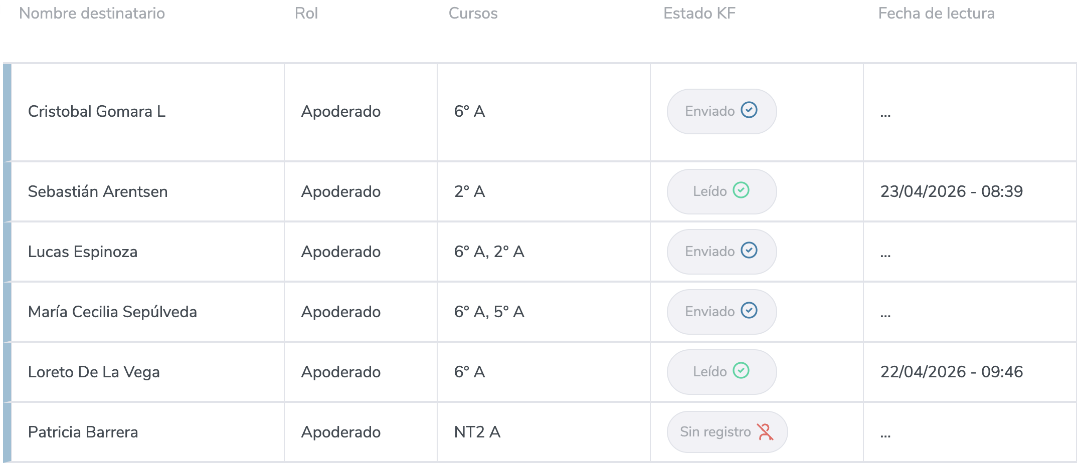 Si el mensaje fue entregado correctamente, aparecerá como "Enviado" en la columna "Estado". En caso que el apoderado no este registrado aparecerá el mensaje "sin registro" y cuando aparece el mensaje "leído" es porque el mensaje fue leído y se muestra la fecha y hora en que se realizó la lectura.
