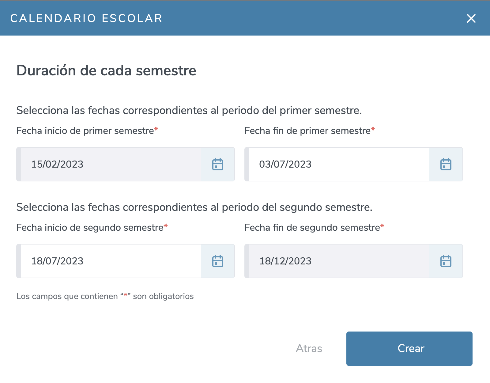- Selecciona las fechas de duración de cada semestre o trimestre según corresponda.