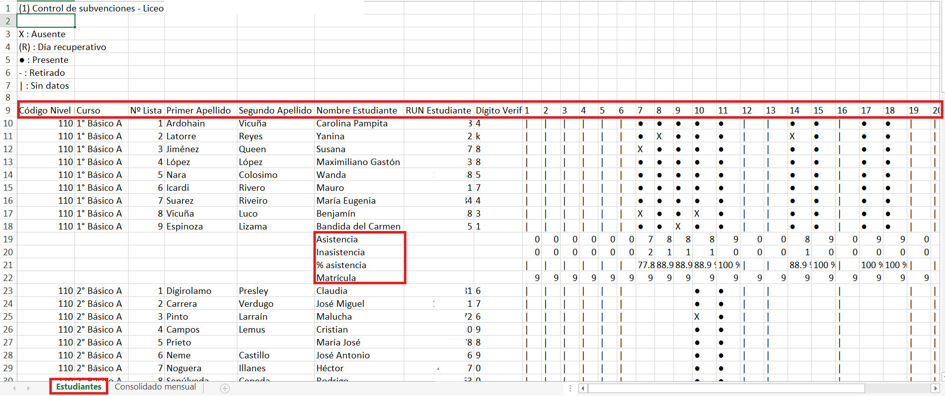 En la segunda hoja, llamada Consolidado Mensual, se podrán visualizar los porcentajes de asistencia diaria correspondientes al mes seleccionado.