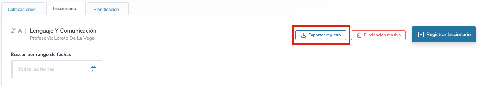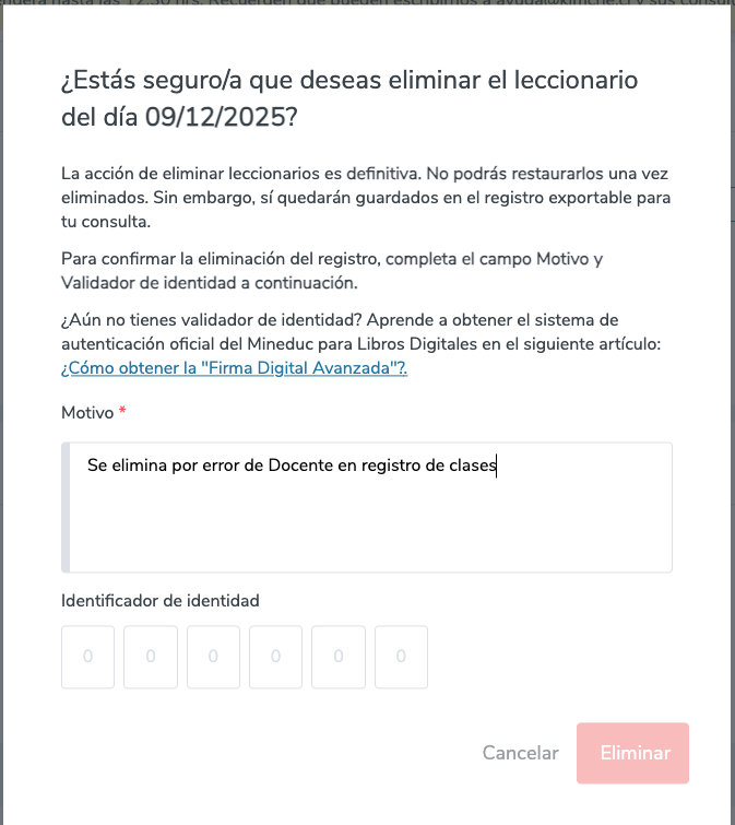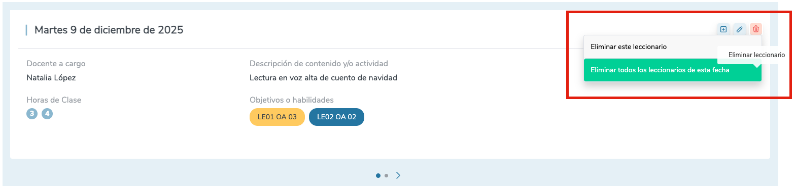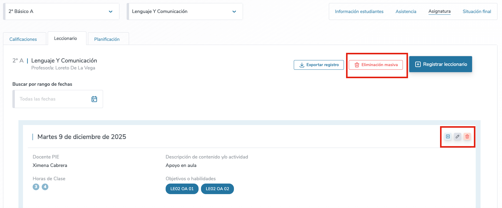 Al ingresar al libro de clases, seleccionar la asignatura e ir a los leccionarios registrados por Docente titular, Co Docente o PIE, aparecerá el ícono de Eliminación Masiva, lo cual les permite seleccionar varios leccionarios a la vez para eliminar. Por otra parte, en el mismo leccionario se puede eliminar con el ícono de basurero.