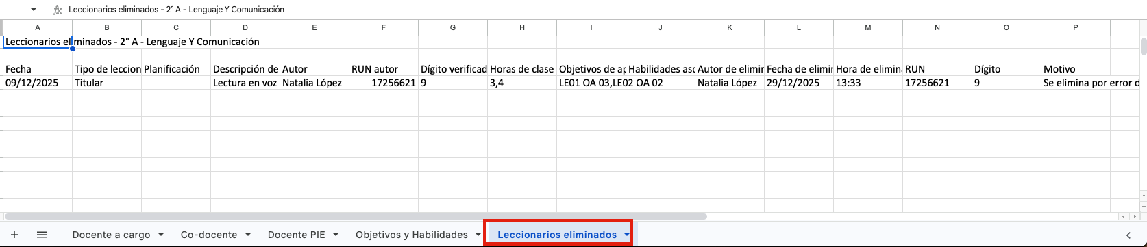 Al exportar se descarga un documento excel, donde verán la hoja: "Leccionarios Eliminados" donde verán la información que se eliminó, quien ejecutó la acción, día, hora y motivo.