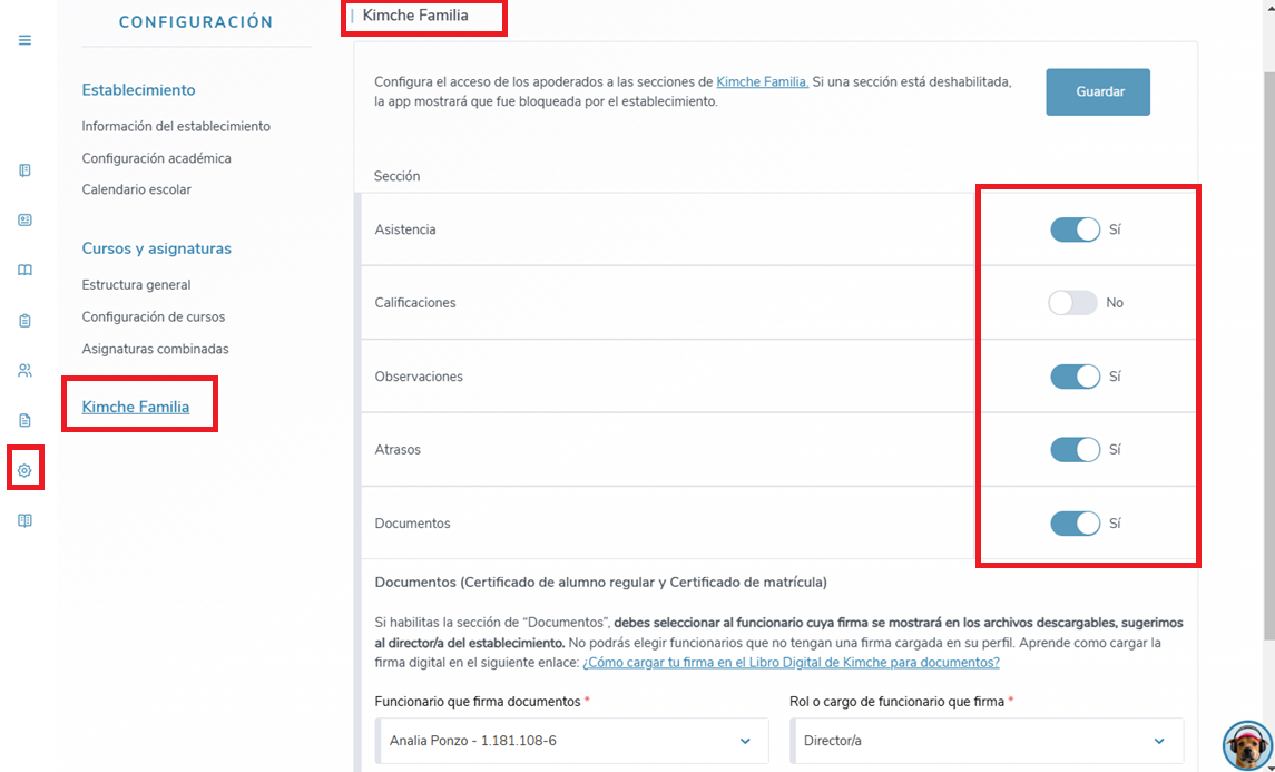 Cada establecimiento, debe configurar las vistas a las que puedan ingresar los apoderados, para esto deben ingresar a la Configuración del Libro Digital, ir a la sección Kimche Familia y seleccionar entre las opciones del menú.