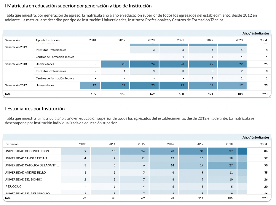- Matrícula y titulación: Podrán visualizar la cantidad de estudiantes que egresan de su establecimiento, cuántos se matriculan y logran titularse.
