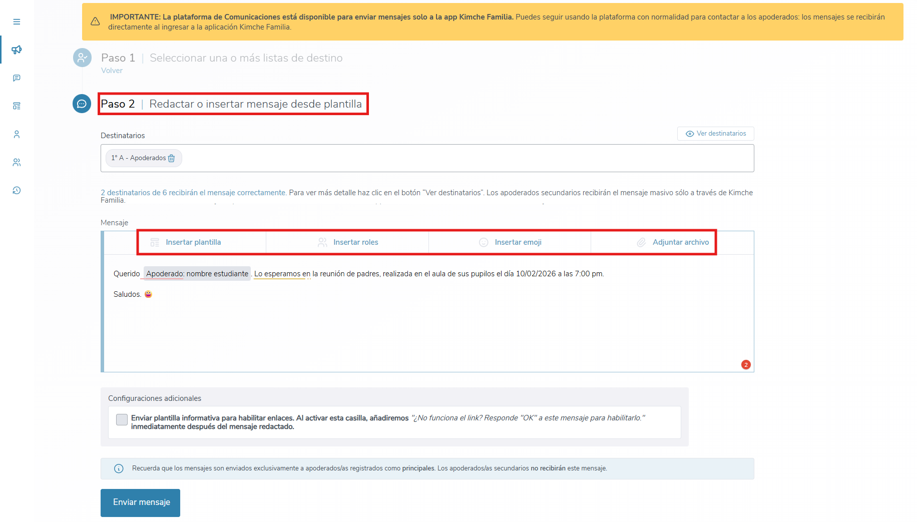 El módulo de Comunicaciones, actualmente está disponible para enviar mensajes a la App Kimche Familia. Puedes seguir usando la plataforma con normalidad para contactar a los apoderados, pero los mensajes se recibirán directamente al ingresar a la aplicación Kimche Familia.