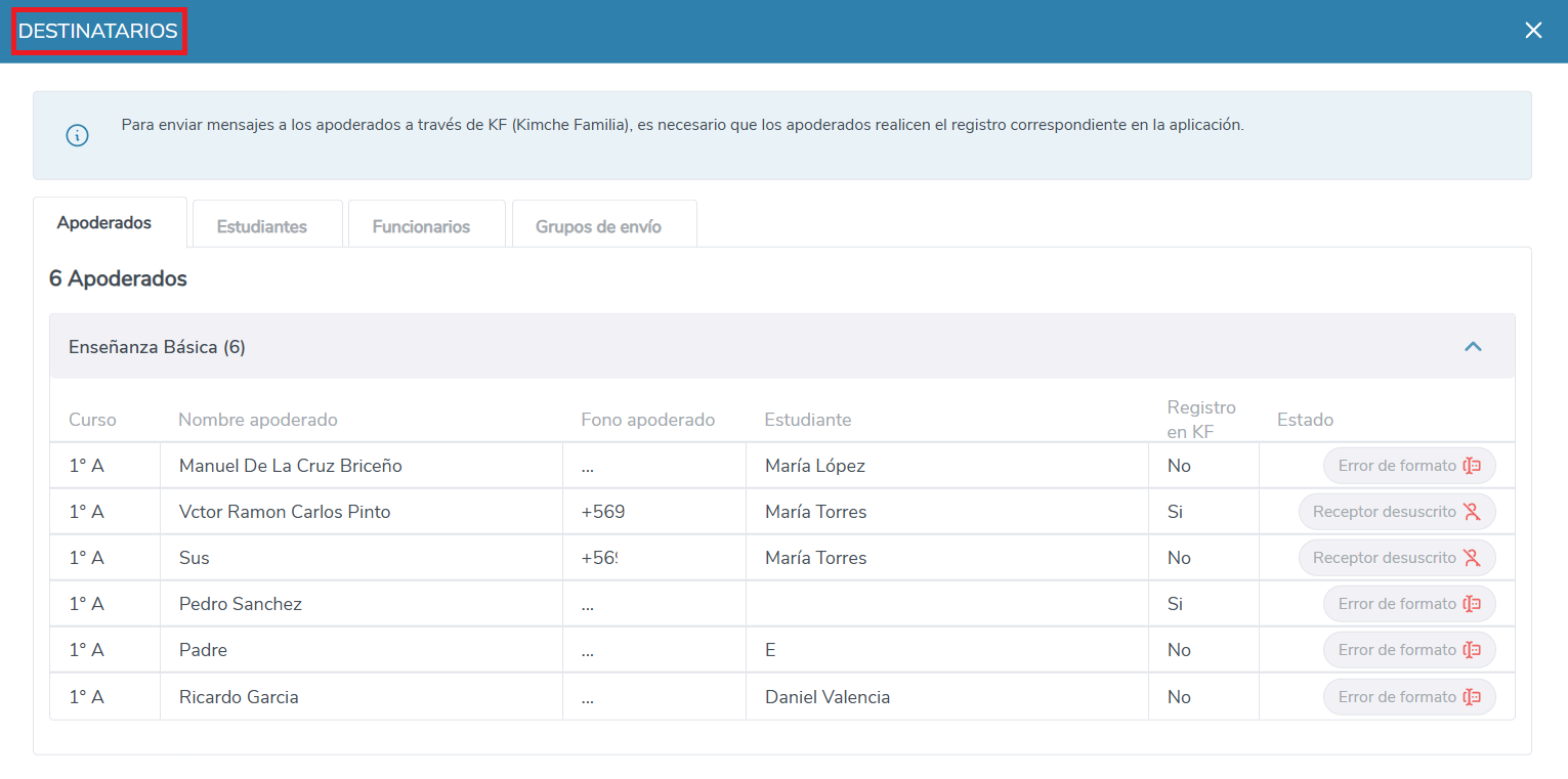 Si seleccionas el botón "Ver destinatarios", que se encuentra a la derecha, podrás ver la lista de las personas a las que les llegará el mensaje y sus teléfonos. Además, podrás verificar si es que hay algún error de formato al ingresar el número de algún destinatario.